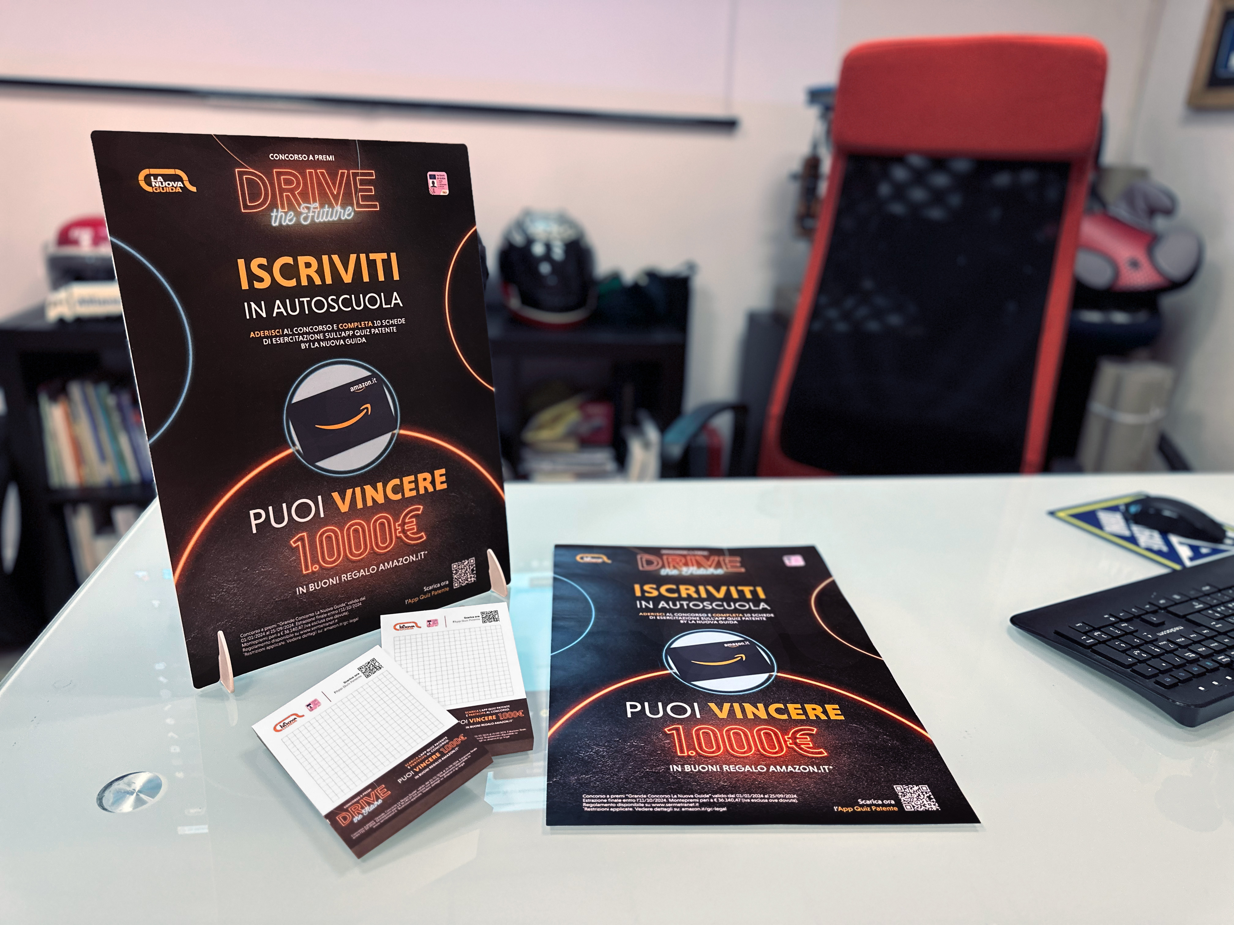 Dalla locandina autoportante ai block notes con il QR code dell’App Quiz Patente, la Scuola Guida avrà a disposizione tanti materiali pubblicitari pensati appositamente per promuovere l'iniziativa presso i propri locali e i propri canali social.