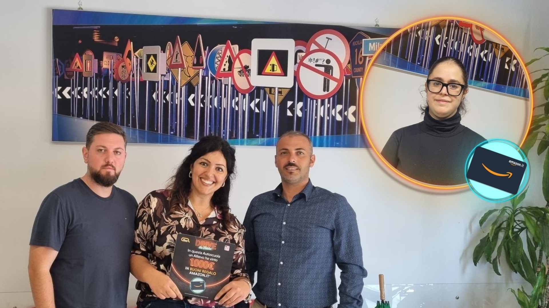 Nel mese di Ottobre è stato estratto e premiato anche il terzo e ultimo Allievo vincitore del Concorso Drive the Future: 1.000 euro in Buoni Regalo Amazon.it*! Si tratta di Rosas Noemi, Allieva dell’Autoscuola Diva Due di Giugliano di Napoli, alla quale abbiamo consegnato una targa per celebrare l'evento.